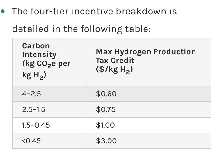 The credits are offered only to projects that can begin construction by 2033, and are valid for 10 years starting when a hydrogen production facility enters service. The credit ranges from $0.60 to $3 per kilo of hydrogen produced, depending on the lifecycle emissions of the hydrogen production.