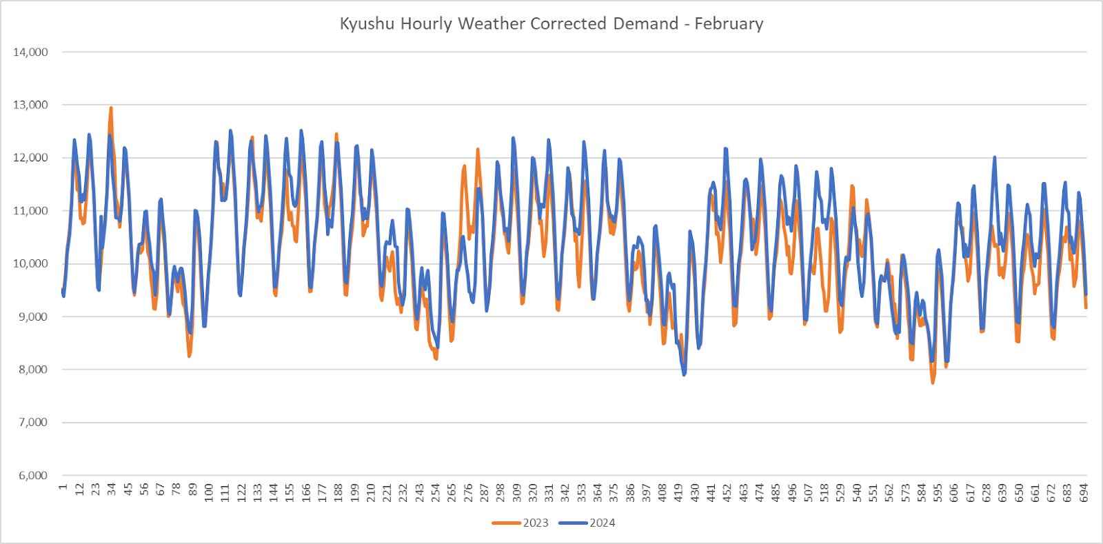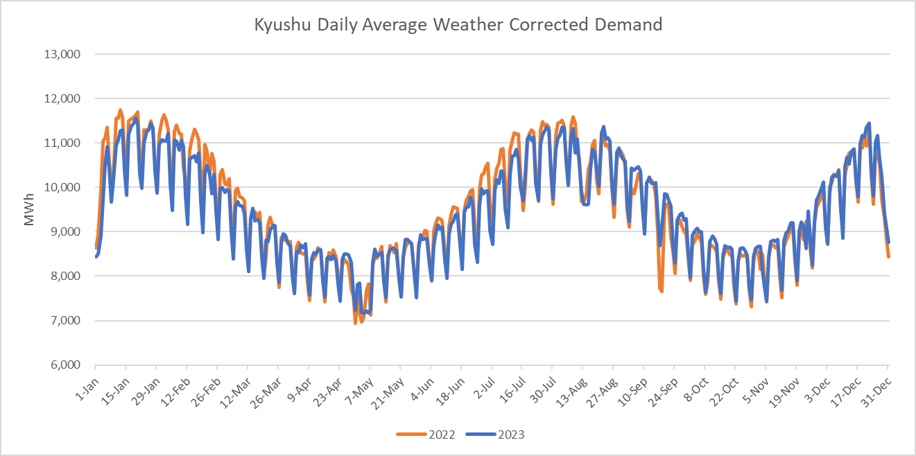 Once we zoom into the electricity demand picture in the Kyushu region, however, things are even more stark. Kyushu’s YoY demand growth turned positive in September 2023. While that particular month’s consumption is ‘artificially’ inflated because of the power outages in Sept 2022 due to Typhoon Nanmadol, the rest of fall and winter 2023/24 shows positive weather-corrected demand growth even as nationwide figures are negative.