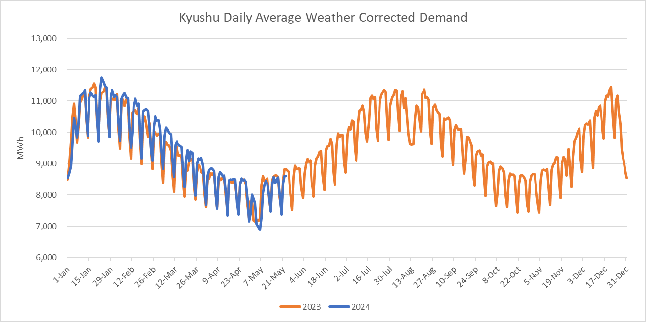On a national level, YoY electricity demand has been 0 or negative between March 2022 and March 2024. This is based on Yes Energy data that filters out weather impact on power demand; the data covers all the major grids in Japan apart from Okinawa. In March 2024, the demand was up 1.9% on a year earlier; in April, it was 0.1%.