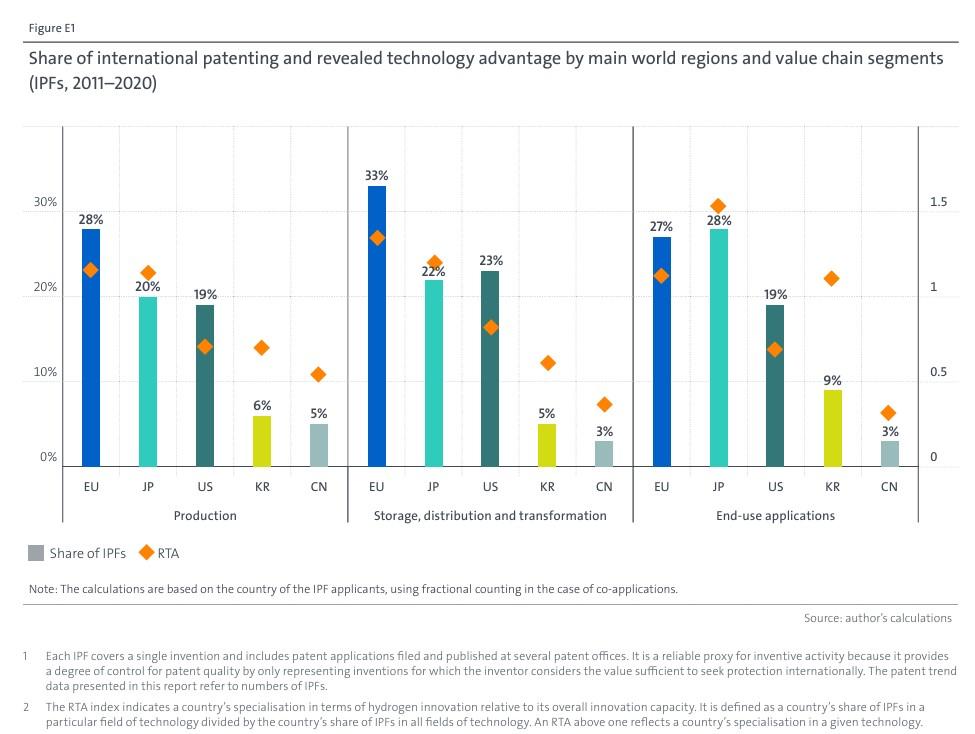 Luckily, scarcity of resources has catalyzed Japan’s R&D. From 2011 to 2020, the country emerged as a top innovator, accounting for 24% of clean hydrogen-related international patent families (IPFs).