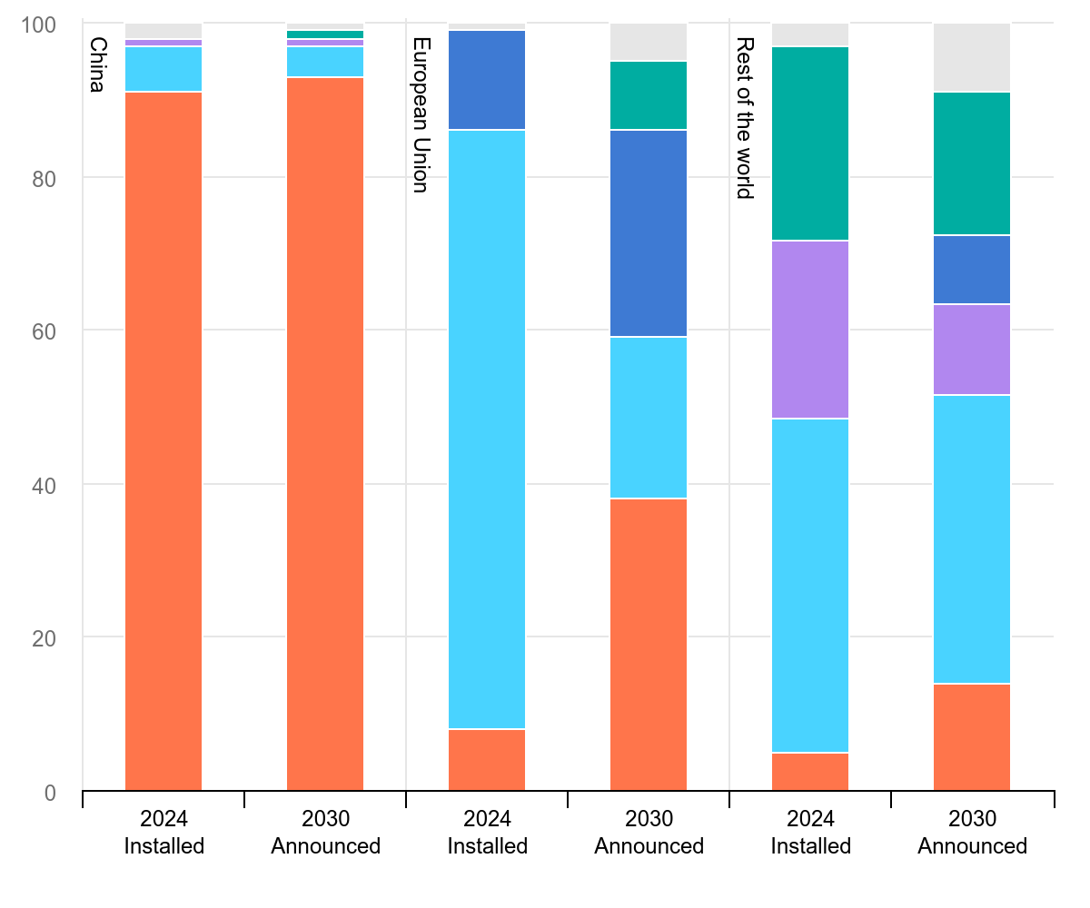 Share of manufacturing capacity by battery producer’s domicile, 2024-2030