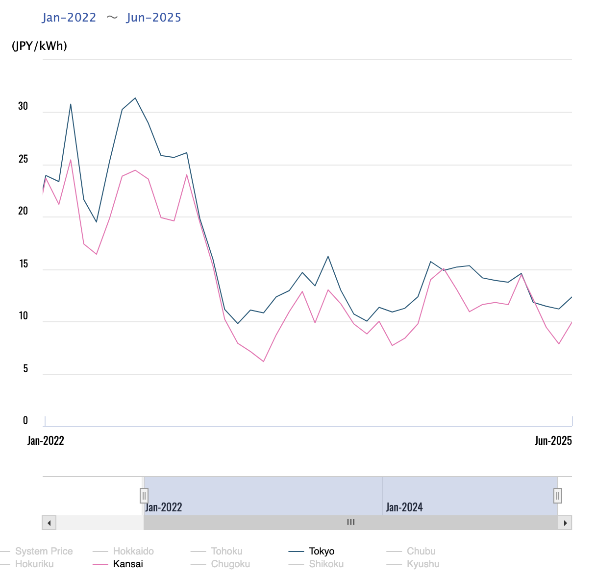 Clear weather boosted solar power generation, leading to lower prices. The monthly average transaction price fell below ¥10 for the first time in 13 months (since April 2024) reaching ¥9.83/ kWh.