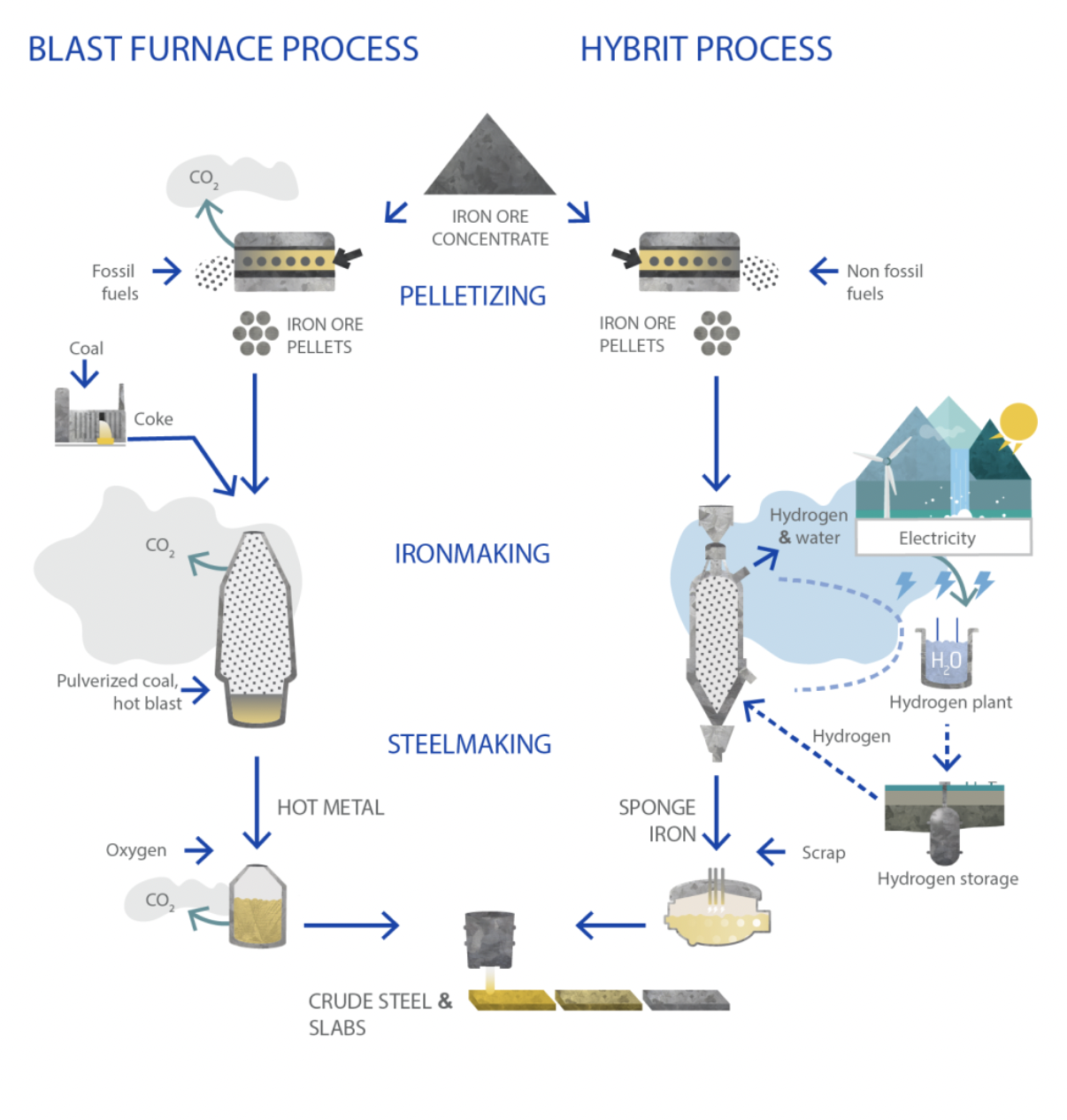In Sweden, HYBRIT made history by moving quickly from concept to pilot, as part of the country’s ambitious commitment to achieve a net-zero carbon economy by 2045. Construction of a pilot direct reduction plant in Luleå began in 2018, and by July 2021, HYBRIT produced the world’s first batch of steel made with 100% green hydrogen instead of coal, delivered to Volvo.