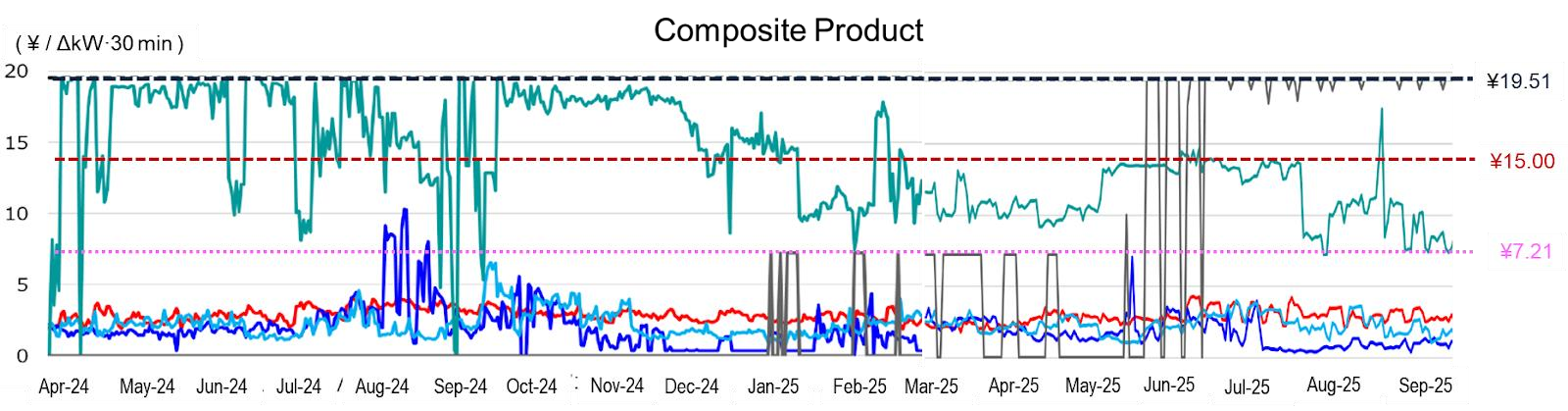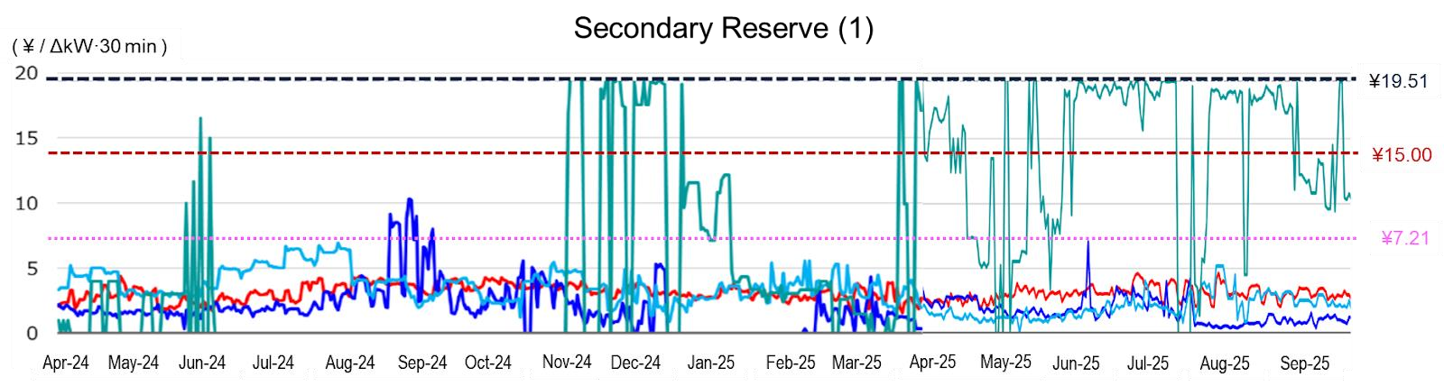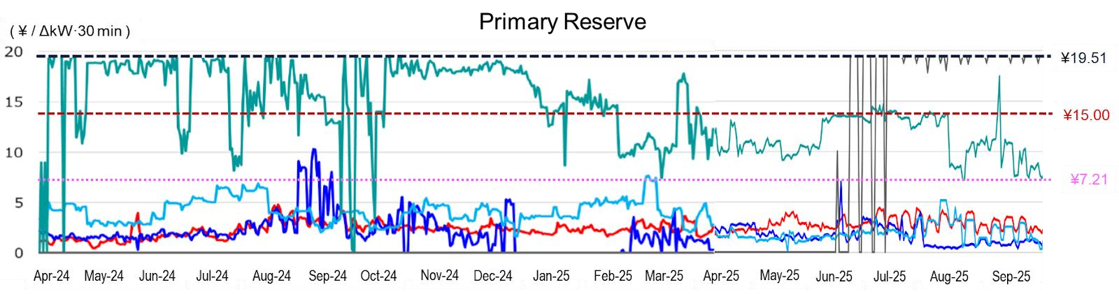 Under the current ¥19.51 cap, bid prices for Primary Reserve (FCR) and Secondary (1) have frequently clustered near the upper bound. Regulators grew concerned that persistent high awards would embed elevated procurement costs across the system.