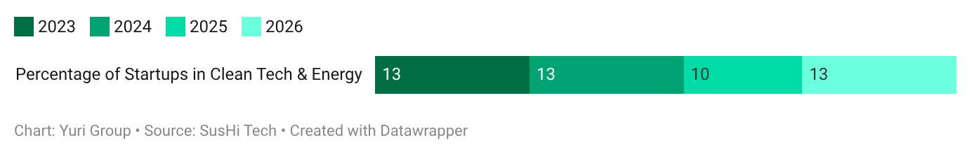 When launched in 2023 as “City-tech. Tokyo”, only 13% of participating startups fell under the clean tech and energy categories. That 13% figure held steady for 2024’s edition, but dipped to 10% in 2025, possibly because food tech was that year’s focus. This year the percentage is back up to 13%, suggesting energy has yet to break out as a dominant area of interest for entrepreneurs in Japan.